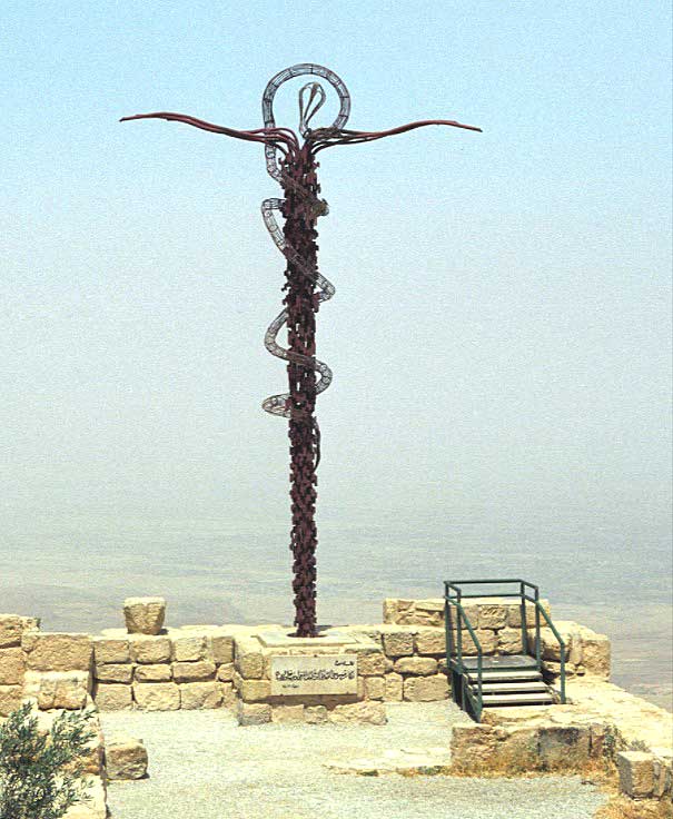 A serpentine cross sculpture atop Mount Nebo was created by Italian artist Giovanni Fantoni. It is symbolic of the miracle of the bronze serpent invoked by Moses in the wilderness and the cross upon which Jesus was crucified.