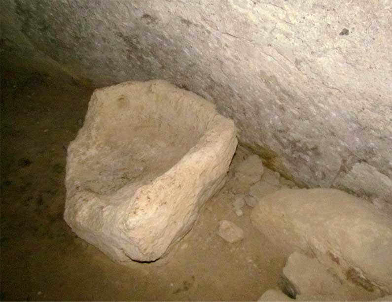 Because the upper room or inn and the main living were already occupied, Mary (with the help of a midwife & other household women) would have given birth in that lower level. She would have wrapped Jesus in swaddling cloths and placed Him in a stone manger just like below.