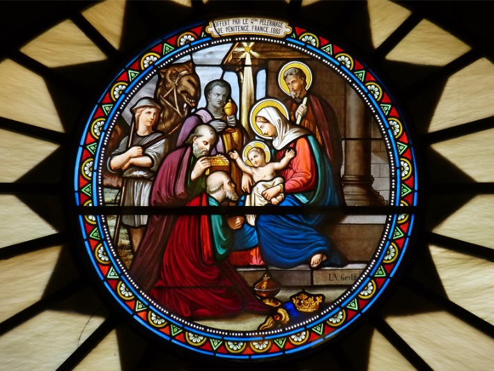 Chapel of Saint Catherine is a religious building that is affiliated with the Catholic Church and is located adjacent to the northern part of the Basilica of the Nativity in Bethlehem in the West Bank in the Palestinian territories. It works as a parish church and Franciscan monastery. Underneath this chapel is a complex of caves and ruins that may also mark the birthplace of Jesus. In the chapel is this beautiful stained glass window depicting the magi presenting their gifts to the King of kings.