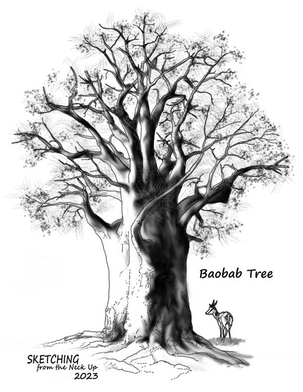 I enjoyed sketching this. The original photo didn’t show the roots and I felt the picture seemed incomplete. So, I Googled it and found enough examples to add the right type of root into the drawing. I also added a small impala to complete it.