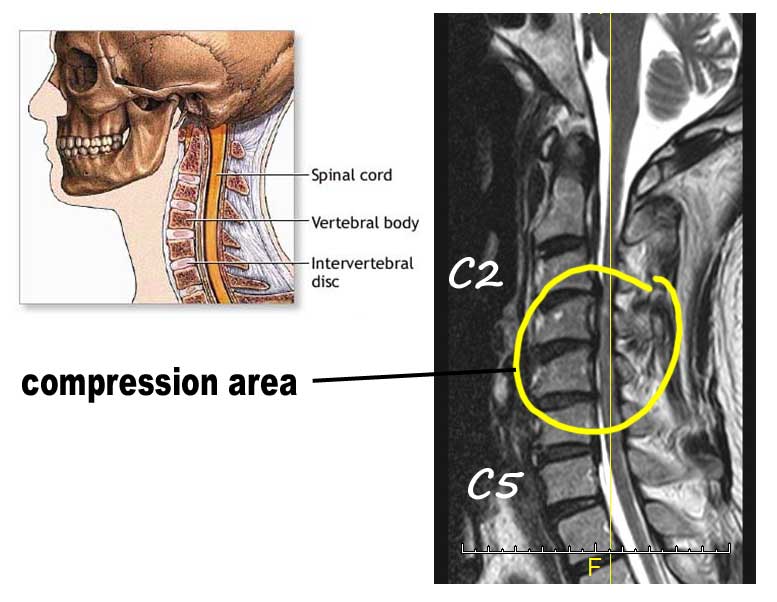 When the nurse wheeled me to the doctor’s office, he showed us a number of x-rays and ct-scan images. His diagnosis was that my upper spinal cord was being compressed.