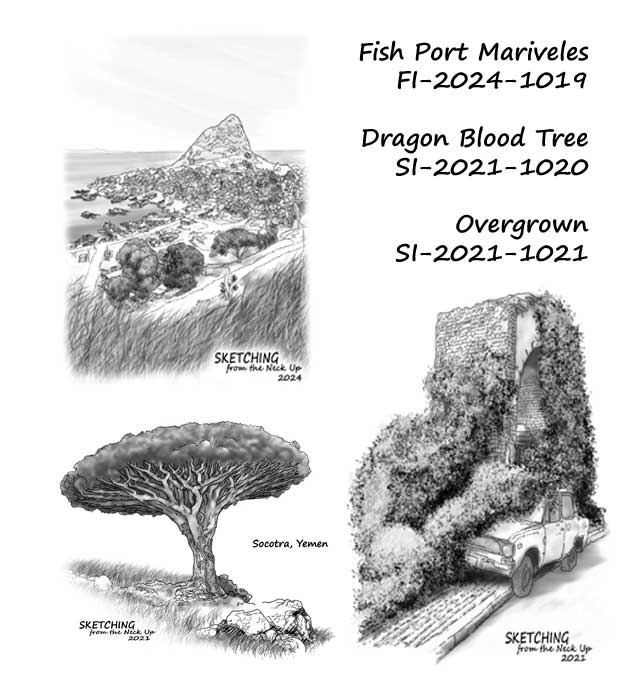 Dragon Blood Tree (SI-2021-1020) – This interesting umbrella shaped tree is native to the Socotra archipelago, part of Yemen, located in the Arabian Sea. It is named after the blood-like color of the red sap that the trees produce. I had a grand time drawing it.
